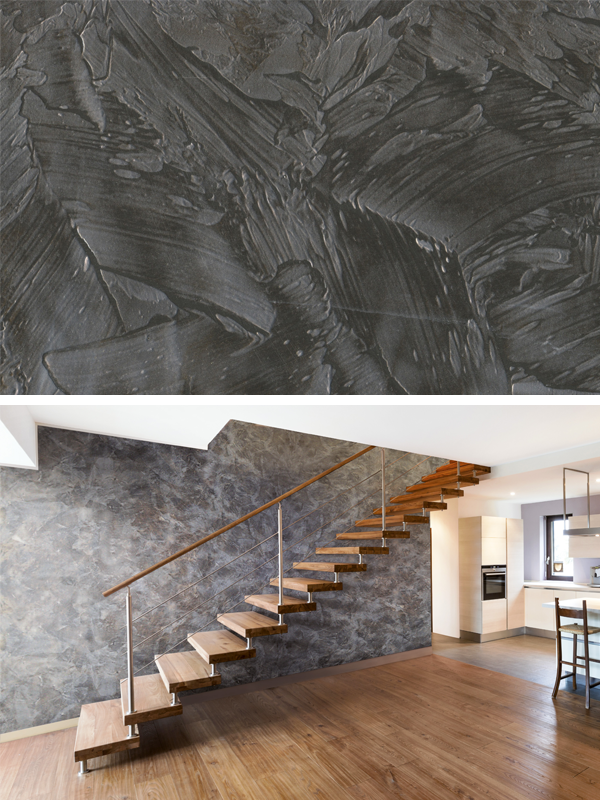 塗膜にはキラキラと輝くゴールドやシルバーの鍛造された金属チップが含まれており、まるでベルベットのような質感を表現。独特のカラーとトーンで、トレンド感のあるインテリアを作り出す。