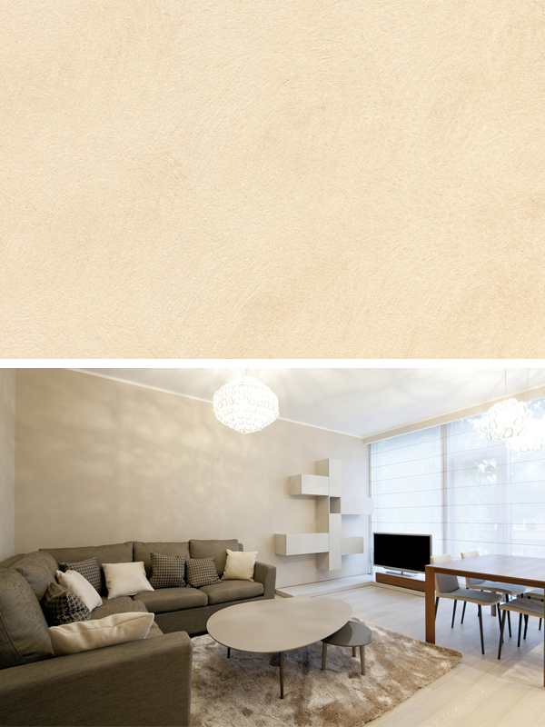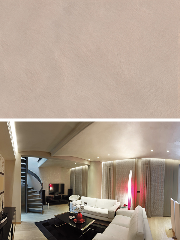 バックスキンのような非常に柔らかな触感。特殊な樹脂と顔料により柔らかな布のような効果をもたらし、極めてエレガントな色合いで空間を演出することができる。