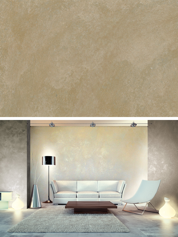 鈍い金や銀、酸化した鉄材のような屋内塗料。鍛造された貴重な金属チップが含まれている塗膜の表面は、ゴールドやシルバーの輝きでサビの風合いを表現し、コンテンポラリーな空間へと彩る。